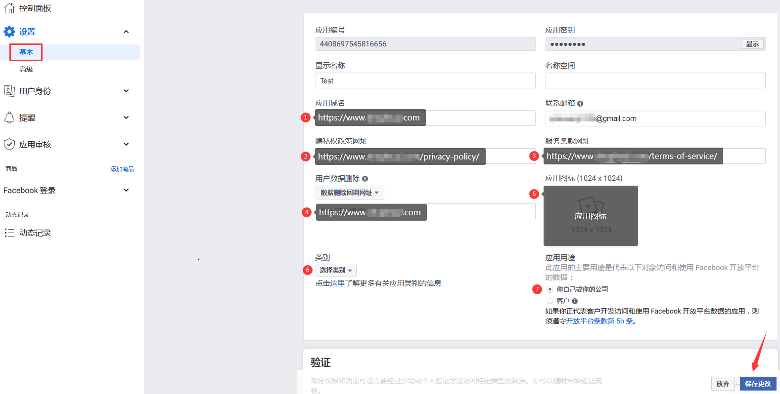 4.回到【设置】->【基本】中,填写应用基础信息: