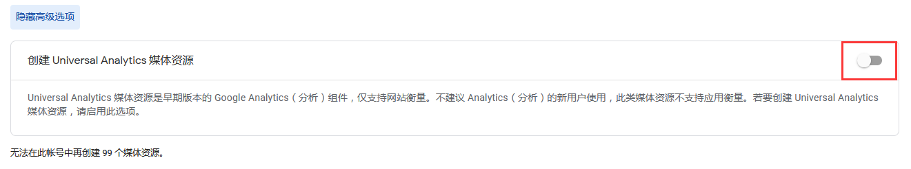 开启【创建Universal Analytics媒体资源】,如果不开启,将无法看到后面的跟踪ID!!!!!