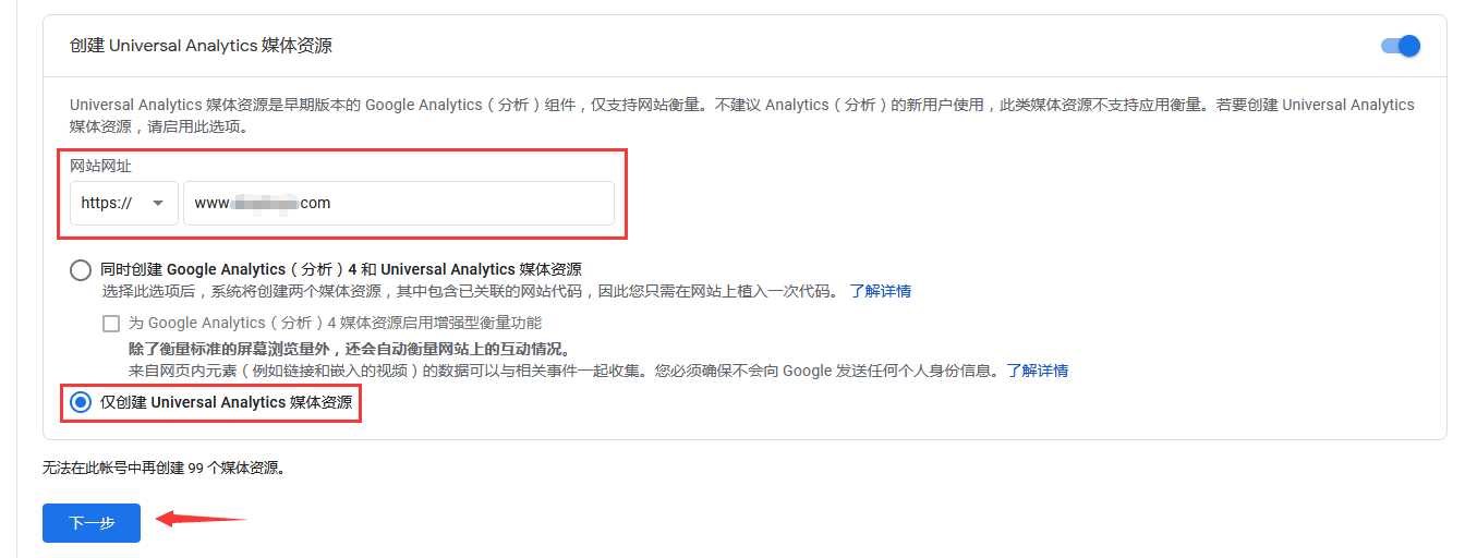 输入网站地址,选择【仅创建Universal Analytics媒体资源】