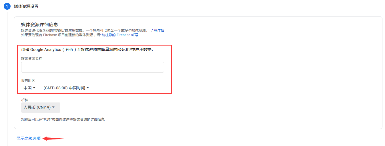 1) 输入【媒体资源名称】,比如您的网站商店名称,确认所在时区;然后点击下方的【显示高级选项】