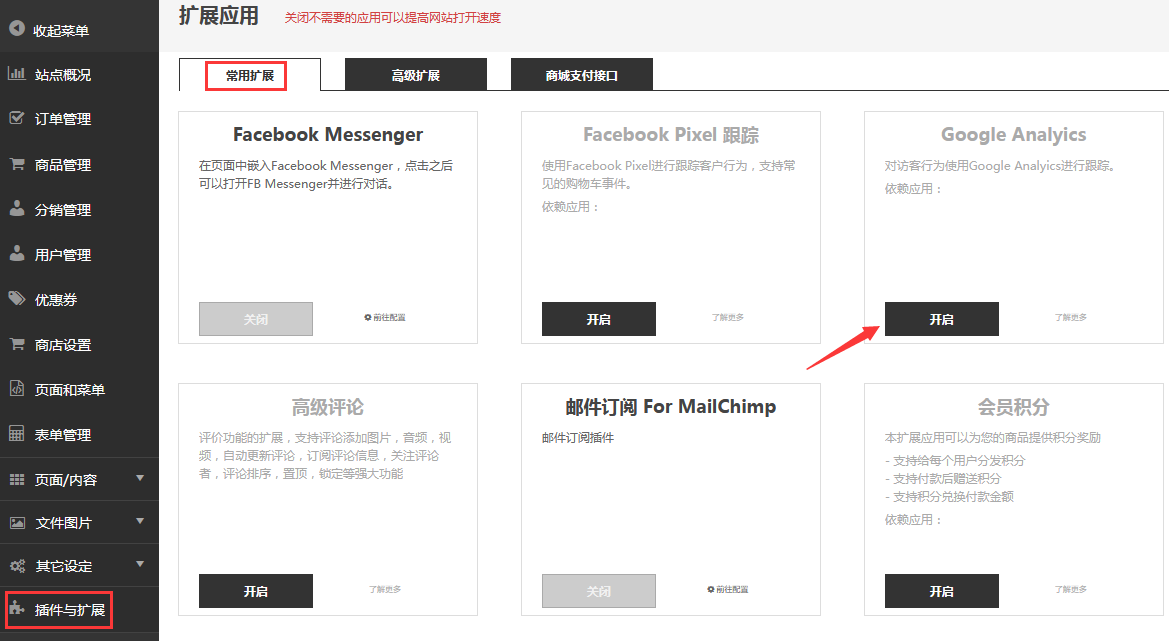 在【插件与扩展】中,【开启】Google Analytics插件